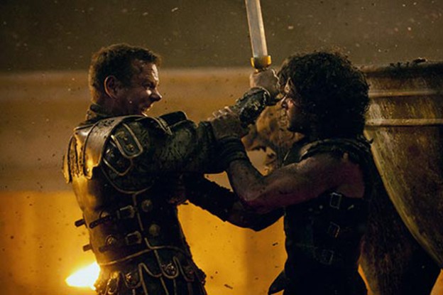 Seventeen years pass in the blink of an eye, and suddenly we’re in Roman settlement Londinium, which is now London. Right away we see even in ancient times, the weather there sucked. Rain pours down in some back alley gladiator coliseum. Blood forms into a puddle on the floor, and a ramshackle group of spectators cries out for more. Among them is the slave trader Graecus (Joe Pingue), looking bored and yearning for the milder climes of the Mediterranean. He’s there to see a combatant dubbed “The Celt,” who’s said to be the best around. The Celt is, of course, young Milo, now all grown up and played by a well-muscled Kit Harington (Jon Snow from Game of Thrones). Milo dispatches his foes with a quickness and Graecus’ eyes light up with dollar signs…or whatever currency the ancient Romans used.